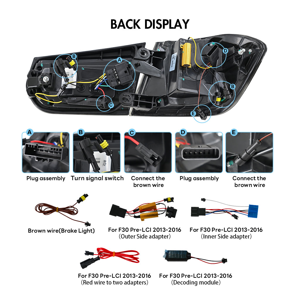 قم بترقية المظهر الخلفي لسيارتك بي إم دبليو الفئة الثالثة F30 سيدان 2013-2018 مع مصابيح خلفية LED من TT-ABCصُممت هذه المصابيح الخلفية LED بالكامل لتوفر مظهرًا عصريًا، ووظائف فائقة، ومتانة طويلة الأمد. تُعد هذه المصابيح الخلفية LED بالكامل البديل الأمثل لمصابيحك الخلفية الأصلية، حيث تجمع بين الأناقة والأداء.