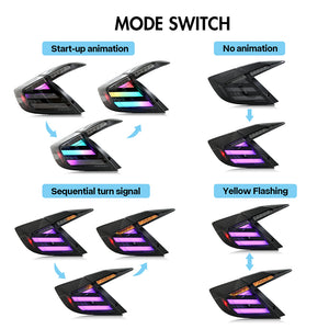 Unleash your Civic's personality with the ultimate lighting upgrade. The TT-ABC RGB LED Tail Light Assembly is engineered as a complete, direct-fit replacement for 2016-2021 Honda Civic 10th Generation Sedan models. This premium set takes customization to the next level with full RGB color control, allowing you to choose from millions of colors and dynamic animation modes. Combined with sequential turn signals, startup animations, and a sleek smoked crystal design, these tail lights deliver unmatched style, enhanced visibility, and a truly personalized driving experience.